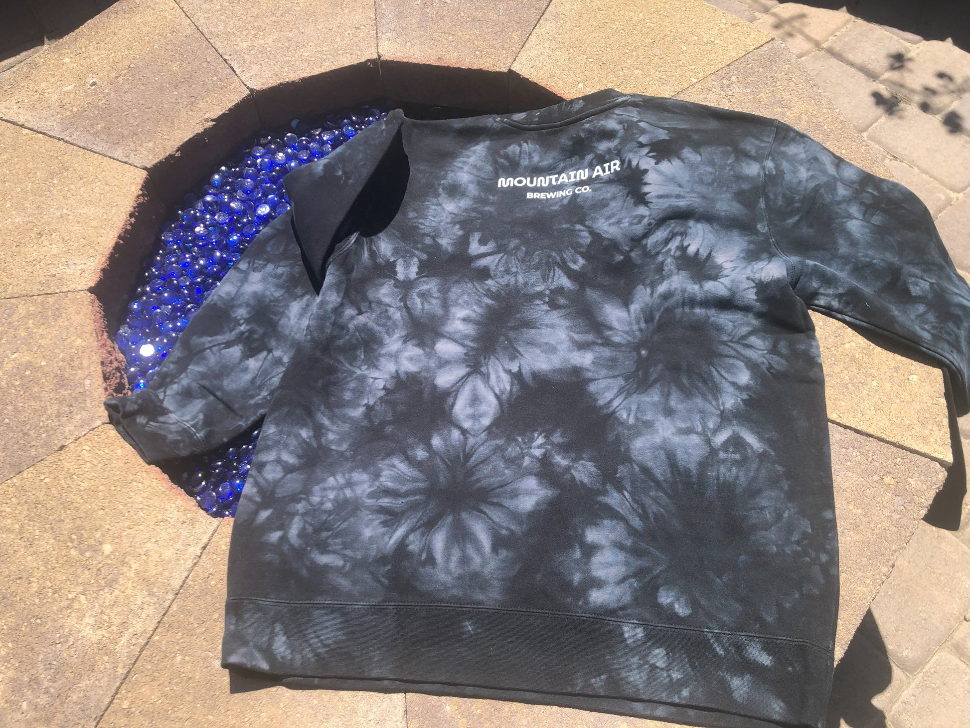Black Crew Neck Tie Dye. Cream colored Mountain Air Brewing logo